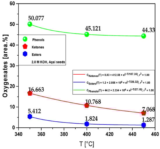Figure 3 illustrates the concentration of oxygenates in bio-oil. The concentrations of phenols, esters, and ketones decrease with increasing pyrolysis temperature, showing a smooth exponential decay behavior, as shown in Figure 3. The results are according to those reported by de Sousa et al. []. The concentration of oxygenates in bio-oil was correlated with a first-order exponential decay model, exhibiting in all the cases a root-mean-square error (r2) of 1.00. According to de Sousa et al. [], the concentrations of cresols, phenols, and ketones decrease with increasing pyrolysis temperature because of deoxygenation reactions converting phenols, esters, and ketones into hydrocarbons, carbon monoxide, carbon dioxide, and water (decarboxylation and decarbonylation). The mechanism of deoxygenation is not well understood, but it seems that the reaction rate of deoxygenation is influenced positively by reaction temperature. Studies show that adipic acid (dicarboxylic acid) can be converted into cyclopentanone via deoxygenation reactions, and at higher temperatures a considerable amount of cyclo-pentene is formed [,].