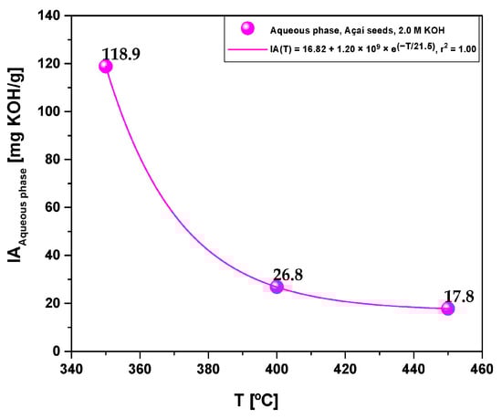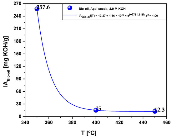 Figure 4 depicts the acid value, which represents the acidity of the bio-oils obtained from the pyrolysis of activated açaí seeds. The results reveal a notable reduction in bio-oil acidity as the pyrolysis temperature increases, following a sharp exponential decay trend. The acid value of the bio-oil ranged from 257.6 to 12.3 mg KOH/g and exhibited a strong correlation with a first-order exponential decay model, demonstrating an r2 value of 1.00. These findings are in line with the observations presented in Figure 4, suggesting that higher concentrations of oxygenates in the bio-oil contribute to elevated levels of acidity.