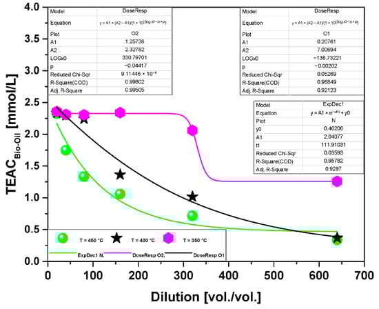 Figure 6 demonstrates the effect of pyrolysis temperatures on the total antioxidant capacity of bio-oil produced by the pyrolysis of açaí seeds (Euterpe oleracea, Mart) with a 2.0 M KOH solution, 1.0 atmosphere, at laboratory scale. The effect of temperature on the average antioxidant capacity of pyrolysis bio-oil is shown in Table 3. As previously described, pyrolysis is a complex process involving the thermal degradation of biomass, and reaction conditions, particularly temperature, play a critical role in determining the chemical composition of the bio-oil []. At different pyrolysis temperatures, various intermediate reactions occur, leading to the formation of different chemical compounds within the bio-oil but also the production of a gaseous and a solid phase with different compositions and characteristics [,,,]. The results presented in Table 3 indicate that the strong antioxidant activity of the bio-oil at 350 °C may be associated with its high concentration of oxygenated compounds at this temperature, particularly phenolic compounds, which account for 50.077 (area.%) of the total oxygenated compounds, as shown in Figure 4. Recently, Valdez et al. [] demonstrated that higher pyrolysis temperatures (450 °C) of açai seeds activated with a 2.0 M KOH solution do not favor the formation of oxygenates in the bio-oil, leading to the formation of hydrocarbon-rich bio-oils. On the other hand, lower pyrolysis temperatures (350 °C) favor the formation of oxygenates, particularly phenolic compounds, in the açai seed bio-oil []. In this context, phenolic compounds are strongly associated with high antioxidant activity, as described in the literature [,,]. The results are according to similar studies reported by del Pozo et al. [], who investigated the effect of temperature on the antioxidant capacity of the pyrolysis bio-oil of coffee silverskin, and by del Pozo et al. [], who investigated the effect of temperature on the antioxidant capacity of the pyrolysis bio-oil of grape pomace, showing that a higher pyrolysis temperature leads to bio-oils with lower antioxidant capacity.