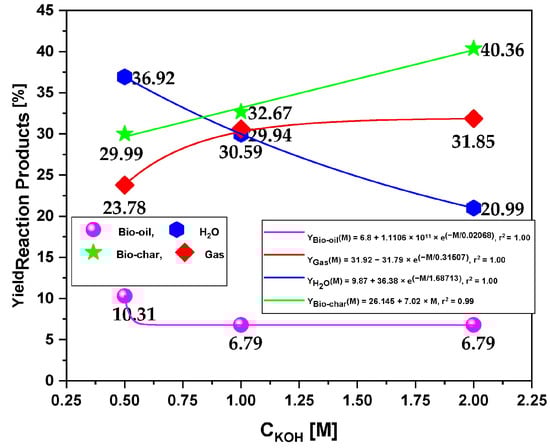 In laboratory-scale pyrolysis experiments, activated açaí seeds were subjected to different concentrations of KOH solution (0.5 M, 1.0 M, and 2.0 M) and pyrolyzed at 450 °C and 1.0 atm in a borosilicate glass reactor. The yields of bio-oil, aqueous phase, biochar, and gas were determined and found to range from 6.79% to 10.31%, 20.99% to 36.92%, 29.99% to 40.36%, and 23.78% to 31.85% (wt.), respectively. The bio-oil yields obtained were higher than those reported by Serrão et al. [], but similar to those reported by Castro et al. []. The yields of biochar were also consistent with those reported in previous studies of açaí seed pyrolysis chemically activated with NaOH [,,], KOH [,,,,,,,,,,], H3PO4 [,], and HNO3 [,]. Chemical activation of biomass with alkalis may enhance the bio-oil yield as reported by Wang et al. [], as well as promote cracking of long-chain molecules into smaller gas molecules. This effect is attributed to the presence of alkaline and alkaline earth salts, which act as catalysts for the cracking process. The XRD analysis of the biochar indicated the presence of KOH and its salts, which may have contributed to the observed yields. Figure 7 depicts the data in chart form. The yield of biochar increases linearly with increasing solution molarity and a root-mean-square error (r2) of 0.99, while that of gas increases exponentially and a root-mean-square error (r2) of 1.00, showing that higher molarities favor gas production. The results show that bio-oil yields tend to increase and reach a plateau around 1.0 M; however, physicochemical analysis shows that acidity is heavily lowered when using 2.0 M, and higher amounts of water are obtained, indicating that the mechanism of basic pre-treatment on biomass pyrolysis further deoxygenates the bio-oil, trapping oxygenates in water and biochar phases.
