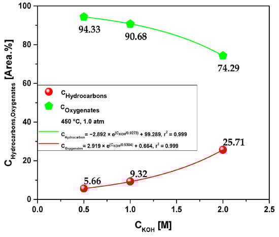 Figure 8 demonstrates the effect of different molarities of KOH solution on the concentration of hydrocarbons and oxygenates in the bio-oil produced by pyrolysis of açaí seeds (Euterpe oleracea, Mart) at 450 °C and 1.0 atmosphere, at laboratory scale.