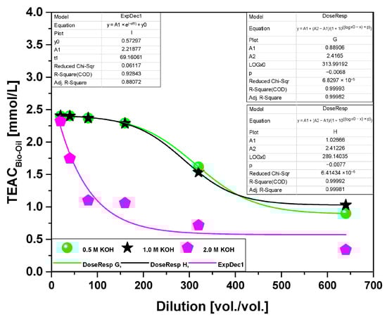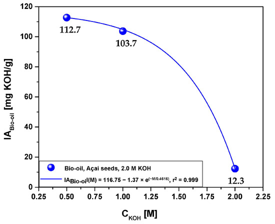 Figure 9 demonstrates the acid value (acidity) of bio-oils obtained from the pyrolysis of açaí seeds (Euterpe oleracea, Mart) that were activated with a 2.0 M KOH solution at 450 °C and 1.0 atmosphere, as well as activated with 0.5 M, 1.0 M, and 2.0 M KOH solutions at laboratory scale. The data indicate that the acidity of the bio-oil decreases as the molarity of the KOH solution increases, following a sharp exponential decay pattern. The acid value of the bio-oil ranged from 113.7 to 12.3 (mgKOH/g) and can be correlated with a first-order exponential decay model, with an r2 value of 0.999. This finding aligns with the results presented in Figure 8, suggesting that higher concentrations of hydrocarbons in the bio-oil lead to lower acidity.