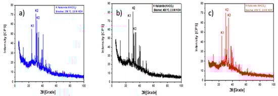 Figure 11 illustrates the XRD of biochar produced by the pyrolysis of açaí seeds at 350 (a), 400 (b), and 450 °C (c), 1.0 atmosphere, and activated with 2.0 M KOH, at laboratory scale, respectively. The diffractogram of biochar illustrated in Figure 11 shows the presence of 01 (one) peak (K2) of high intensity on the position 2θ: 30.0 (100%), and 02 (two) peaks of medium intensity, the first (K1) on the position 2θ: 24.2 (66.8%) and the second (K3) on the position 2θ: 40.6 (68.6%), being all the peaks associated with Kalicinite (KHCO3), the dominant crystalline phase in biochar. The findings from Prakongkep et al. [], who conducted a study on the chemical properties, elemental analysis, and nutrient content, as well as the morphological and crystalline characteristics of biochar obtained from the pyrolysis of durian shell at 350 °C and at laboratory scale, align with the results of this study. Prakongkep et al. [], observed that the dominant crystalline phase identified in the biochar was Kalicinite (KHCO3).