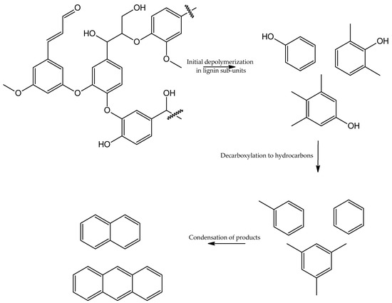 The concentration of phenolic compounds decreased from 55 to 43%, contrary to what was proposed by these authors, where phenolic compounds formation is favored by the presence of alkaline ions. The number of hydrocarbons was greater for the KOH-activated pyrolysis and suggests that some phenolic compounds further reacted and formed hydrocarbons. It is important to note that compound identification through GC-MS is a hard task and even more so when complex molecules or matrices are involved, as in the case of the organic bio-oil. As suggested by Mahadevan et al. [], the KOH-activated bio-oil did not contain furans, where the non-activated contained 5.75% furan derivatives. Mahadevan et al. [], commented about alkali metals suppressing the formation of HMF in the bio-oil. Considering their observations, the following reaction mechanism is proposed for KOH-activated lignin depolymerization, as shown in Figure 12.