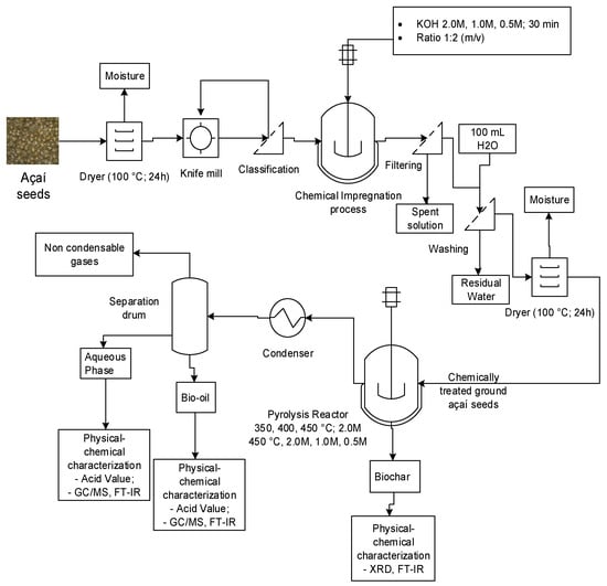 Process flow schema of bio-oil production by pyrolysis of açaí seeds at 350, 400, and 450 °C, 1.0 atm, 2.0 M KOH, and 450 °C, 1.0 atm, 0.5 M, 1.0 M, and 2.0 M KOH, using a fixed bed reactor, at laboratory scale.