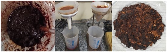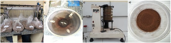 The açaí (Euterpe oleracea, Mart.) seeds were subjected to drying in an oven controlled by an analog device (DeLeo, Porto Alegre, Brazil, Model: DL-SE) at a temperature of 105 °C for a duration of 24 h. Afterwards, the dried seeds were ground using a laboratory knife cutting mill (TRAPP, Jaraguá do Sul/SC, Brazil, Model: TRF 600). Then, the dried and ground açaí seeds were sieved using a set of sieves of 28, 35, 48, and 60 mesh in order to remove the excess fiber material, as well as to decrease the specific particle diameter. The drying, grinding, and sieving of açaí seeds are shown in Figure 15.