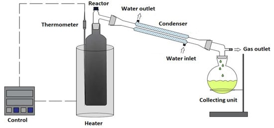 - Mâncio, A.A.; da Costa, K.M.B.; Ferreira, C.C.; Santos, M.C.; Lhamas, D.E.L.; da Mota, S.A.P.; Leão, R.A.C.; de Souza, R.O.M.A.; Araújo, M.E.; Borges, L.E.P.; et al. Process analysis of physicochemical properties and chemical composition of organic liquid products obtained by thermochemical conversion of palm oil. J. Anal. Appl. Pyrolysis 2017, 123, 284–295. [Google Scholar] [CrossRef]