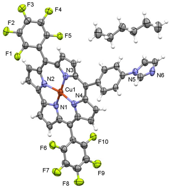Single-crystal X-rays can clearly reveal the molecular structure of corrole complexes. The single-crystal structure of PFIC-Cu illustrates that it contains an imidazole moiety and exhibits that the Cu ion has successfully coordinated with the four N atoms at the corrole’s center. Also, the Cu ion is in the same plane as the corrole macrocycle (Figure 1). Specific crystal data are detailed in Table S1. The crystal data accurately demonstrate that the lengths of these four Cu-N bonds range from 1.87 to 1.89 Å and that they have an average length of 1.883 Å, which happens to be in agreement with the electronic structure of d8 CuIII [39]. Otherwise, the large angles of ∠N1-Cu-N3 and ∠N2-Cu-N4 produced by the coordinating atoms are 166.0° and 167.7°, respectively, indicating that the Cu is slightly off-center. The PFIC-Cu’s crystallographic information can be obtained for free at the Cambridge Crystallographic Data Centre; its CCDC dentifier is 2301493