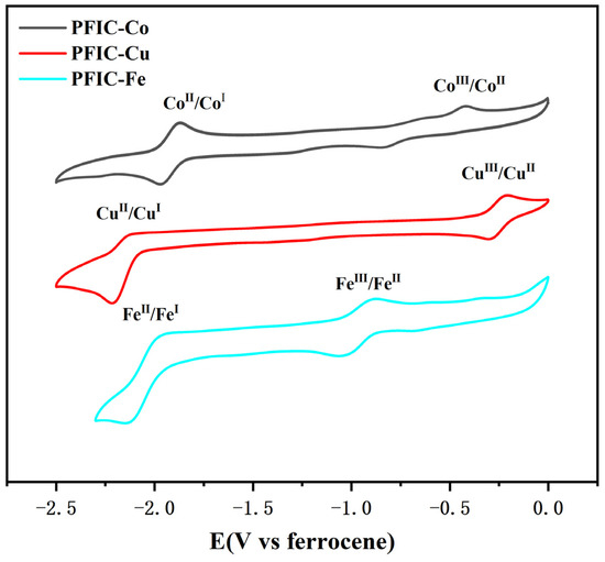 CVs of the metal complexes PFIC-Co, PFIC-Cu, and PFIC-Fe (1.0 mM) in DMF (0.1 M TBAP).