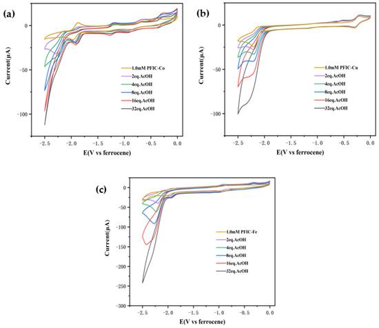 CV curves of compounds PFIC-Co (a), PFIC-Cu (b), and PFIC-Fe (c) (1.00 mM) with increasing AcOH content (0–32 equiv.).