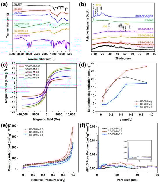(a) FTIR spectra of CZ-600, CZ-700, CZ-800, CZ-600-M-0.03, CZ-600-M-0.9, and SOM-ZIF-8@PS. (b) XRD patterns of CZ-600, CZ-600-M-0.03, CZ-600-M-0.9, CZ-700-M-0.9, CZ-800-M-0.9, and SOM-ZIF-8@PS. (c) Magnetization curves of CZ-600-M-y (y = 0.03, 0.1, 0.3, 0.5, and 0.9). (d) Saturation magnetization of CZ-600-M-y, CZ-700-M-y, and CZ-800-M-y (y = 0.03, 0.1, 0.3, 0.5 and 0.9). (e) N2 sorption-desorption isotherms of CZ-600-M-0.5, CZ-700-M-0.5, and CZ-800-M-0.5 at 77 K. (f) DFT pore size distributions of CZ-600-M-0.5, CZ-700-M-0.5, and CZ-800-M-0.5.