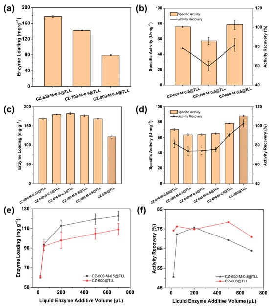 Comparison of (a) enzyme loading, (b) specific activity and activity recovery of CZ-x-M-0.5@TLL (x = 600, 700, and 800). Comparison of (c) enzyme loading, (d) specific activity and activity recovery of CZ-600-M-y@TLL (y = 0.03, 0.1, 0.3, 0.5, and 0.9) and CZ-600@TLL (shaded in the figure). Comparison of the changes in (e) enzyme loading and (f) activity recovery of CZ-600@TLL, and CZ-600-M-0.5@TLL with increasing liquid enzyme addition volume.