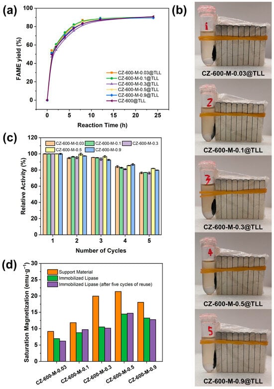 (a) Comparison of CZ-600@TLL and CZ-600-M-y@TLL biocatalysts in biodiesel production. (b) Photographs of CZ-600-M-y@TLL separated and recycled from the reaction system by the magnet after finishing the reactions. (c) Comparison of the reusability of different CZ-600-M-y@TLL. (d) Comparison of the saturation magnetization of different CZ-600-M-y support materials, CZ-600-M-y@TLL immobilized lipases, and them after five cycles of reuse.