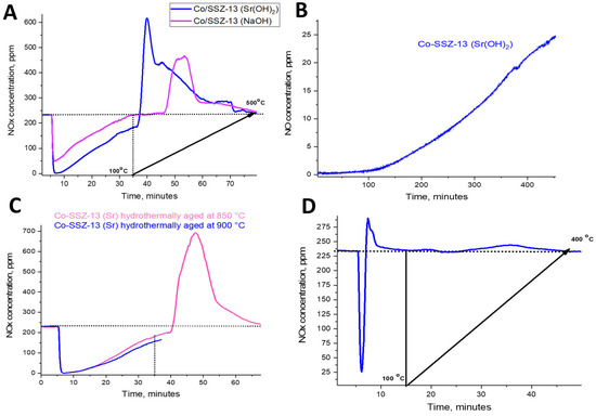 (A) NOx adsorption on Co-SSZ-13 samples derived from NaOH and Sr(OH)2 synthetic routes at 100 °C for 30 min (after 5 min bypass) followed with TPD (10 °C/min). The feed gas mixture contains approx. 220 ppm of NOx, 14% O2 and 300 ppm H2O. Sample mass 120 mg. Total flow rate 300 sscm/min. (B) NOx adsorption on Co-SSZ-13 samples derived from an Sr(OH)2 synthetic route at 23 °C while a flowing gas mixture containing 27 ppm of NO, 20% O2 and 300 ppm H2O (adoption of NO from ambient air keeps the NO level below 2 ppm for 160 min). Sample mass 120 mg. Total flow rate 300 sscm/min. (C) NOx adsorption on a Co-SSZ-13 sample derived from an Sr(OH)2 synthetic route at 100 °C for 30 min (after 5 min bypass) followed with TPD (10 °C/min). The feed gas mixture contains 220 ppm of NOx, 14% O2 and 300 ppm H2O. Sample mass 120 mg. Total flow rate 300 sscm/min. The sample was first hydrothermally aged at 850 °C and tested for PNA. Then it was further hydrothermally aged at 900 °C and PNA adsorption capacity was recorded at 100 °C for 30 min (after 5 min bypass). (D) NOx adsorption on Co-SSZ-13 samples derived from an Sr(OH)2 synthetic route at 100 °C for 10 min (after 5 min bypass) followed with TPD (10 °C/min). The feed gas mixture contains 220 ppm of NOx, 200 ppm CO, 14% O2 and 3% H2O. Sample mass 120 mg. Total flow rate 300 sscm/min. Note that for vehicle-related applications, adsorption is conducted in the presence of higher amounts of moisture and typical exhaust gases at 100 °C. For adsorption of NOx at ambient pressure and temperature (NO as an air pollutant), typical conditions do not include high water levels.