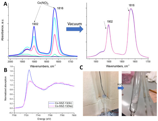 The issue of controlling Al siting in zeolites is a very complex and unresolved one [39,40,41,42,43,44,45,46,47,48,49,50,51,52,53,54,55,56]. It is universally accepted that the measure of the number of Al pairs in zeolitic materials can be determined by Co(II) ion exchange capacity [38,57,58,59,60,61]. Co(II) ions are generally assumed to exist almost exclusively as Co(II)/2Al species in zeolites. We exchanged both NH4-SSZ-13 samples with Co(II) ions under identical conditions and calcined in the air flow at 650 °C. The resulting blue-powders with isolated Co(II) ions in distorted tetrahedral environment [62] on air slowly (5–7 days) regain the pink color due to moisture adsorption and coordination of moisture to tetrahedral Co to form square-pyramidal and octahedral Co aqua complexes (Figure 3C) [62]. X-ray absorption near edge structure (XANES) spectroscopy analysis of both samples shows that Co is six-coordinate and present in a +2 oxidation state [63,64]. XANES for the Co sample prepared from SSZ-13(Sr) showed better signal intensity than for the one prepared from SSZ-13(Na), already suggesting to us that cobalt is present in higher amounts (Figure 1B and Figure S1) [samples were prepared with the identical masses of sample and thus identical pressed pellets]. With infra-red spectroscopy we studied NO adsorption on Co/SSZ-13 material (Figure 3A). NO adsorption produces two NO stretches that grow in concert upon NO titration. They belong to Co(II)(NO)2 complex [62,65,66,67,68,69,70,71,72] with symmetric NO stretch at 1902 cm−1 and asymmetric NO stretch at 1816 cm−1. This is typical for atomically-dispersed Co(II) ions in zeolite [62,65,66,67,68,69,70,71,72]. Co ions in a synthesized SSZ-13 sample exist in extra-framework positions and not in silanol nests/silica matrix: the latter vibrate at slightly lower frequencies [62,65,66,67,68,69,70,71,72]. Importantly, 1 cobalt ion can adsorb up to 2 NO molecules. Co(NO)2 complexes survive under vacuum at elevated temperature (Figure 3A). This suggested to us Co/SSZ-13 materials would be useful for NO adsorption from ambient air. NO is a nuisance pollutant and Co-containing systems could potentially show promise for NO adsorption from ambient air. For these materials, it would be important to maximize the number of Co(II) ions per SSZ-13 mass: the amount of adsorbed cobalt correlates linearly with the number of Al pairs in siliceous SSZ-13 material.