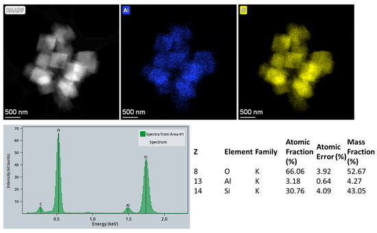 Representative HAADF-STEM image of H-SSZ-13 (Sr) crystals and the corresponding EDS mapping of these crystals, showing the presence of Si, Al, O. The corresponding mass and atomic concentrations of Si, Al, O are summarized in the table.