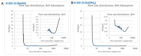 We also performed BET and pore size measurements for H-SSZ-13 (Sr) and H-SSZ-13 (Na) samples (Figure 5 and Table 1). Both samples show nitrogen adsorption isotherms consistent with a well-defined microporous material with a steep nitrogen uptake at low P/P0 ratios (Figure 6 shows BJH pore distribution during adsorption).