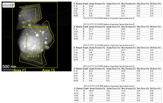 EDS maps of the selected parts shown in the HAADF-STEM image. Note: Area 1 refers to the total area of the sample and shows its average composition.