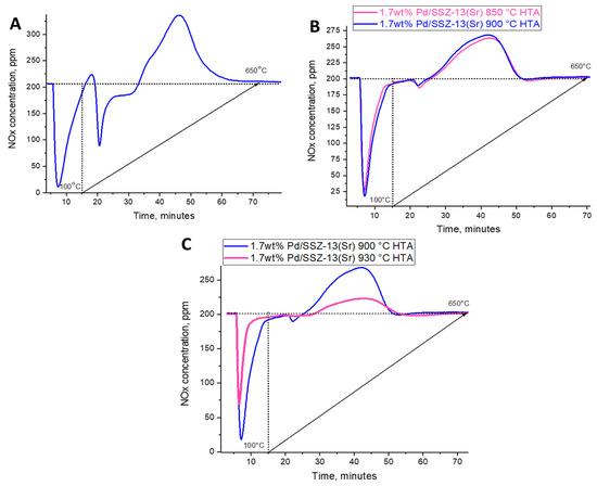 This remarkable property of Co/SSZ-13(Sr) material, thus, prompted us to load 1.7 wt% Pd in its micropores and study its PNA properties and the hydrothermal stability of the resulting Pd-containing SSZ-13 composite [20,21,23,24,25,26,27,28,29,30,31,32,33,34,35,36,37,38]. Indeed, the sample shows excellent PNA performance after loading Pd in it (Figure 8A).