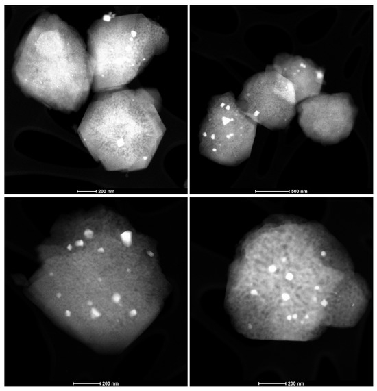 Representative HAADF-STEM images of a 930 °C hydrothermally aged 1.7 wt% Pd/Co-SSZ-13 catalyst. The bright spots decorating the surfaces are Pd and PdO nanoparticles. It is obvious that the crystals are zeolite crystals that are preserved; however, formation of mesopores inside the crystals after steaming is obvious (darker areas inside the zeolite crystals).