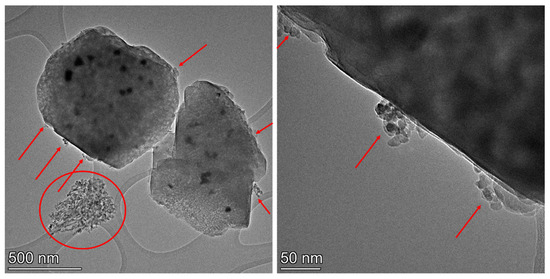 HRTEM images of a 930 °C hydrothermally aged 1.7 wt% Pd/Co-SSZ-13 catalyst. Red circle shows agglomeration of alumina clusters. Red arrows show alumina clusters formed on the external surfaces of zeolite crystals.