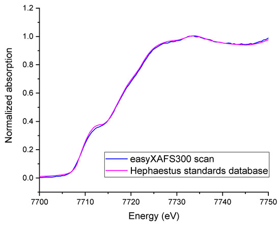 XANES data collection on Co/SSZ-13 samples was performed on a bench-top easyXAFS300 instrument (easyXAFS, Renton, WA, USA). Details about the instrument can be found elsewhere [80]. One hundred twenty mg of each Co-SSZ-13 sample was pressed into a pellet (13 mm diameter) in order to obtain a sufficient count rate for the quite low amount of Co in the zeolite matrix. The pellet was wrapped into a polyimide (Kapton) tape to maintain its integrity. Co K-edge spectra were collected using a Ge444 spherically bent crystal analyzer and Mo anode X-ray tube. The data quality was assured by comparing the Co K-edge scan of Co foil collected with the easyXAFS300 instrument to the Co K-edge scan of Co foil collected at the synchrotron facility and available in the Hephaestus standards database, Demeter version 0.9.26, Figure 13. Spectra were deadtime corrected and the energy edge was calibrated using the Co foil standard, accounting for the non-linear shift in energy. The Co-SSZ-13(Sr) sample had a higher amount of Co, which allowed us to collect high-quality XANES data with an edge step of 0.54; the sample Co-SSZ-13(Na) did not yield in the good quality spectra due to a lower amount of Co in the zeolite matrix; the edge step was 0.3 and the white line was suppressed due to the sorbing matrix of zeolite, Figure 1.