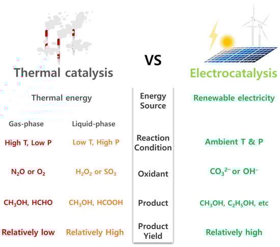 Thermal catalysis vs. electrocatalysis for selective oxidation of CH4.