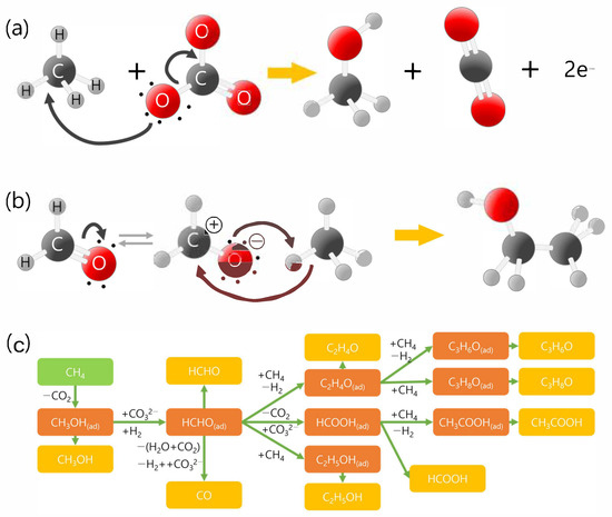 Methane possesses a tetrahedral geometry characterized by high symmetry and low polarity. As methane exhibits the highest dissociation energy of the C–H bond (439.3 kJ mol−1) among alkanes, activation of C–H bonds in methane has proved challenging [10,11,12]. Additionally, during the partial oxidation of methane, most intermediates (CH3OH, HCHO, HCOOH, and C2H4) are less stable than methane itself, thus resulting in low yields of these intermediates under the harsh conditions used for methane activation [1,13,14]. Therefore, the current commercial methane conversion process is based on an indirect route using syngas, which is a mixture of CO and H2. This is an energy-intensive process, and only large-scale plants are cost-competitive [15,16]. Numerous studies have been conducted using various thermal catalysts due to the advantages of direct methane conversion technology. However, the need for expensive oxidants, including H2O2 and N2O, and low product yields remain challenges [17].