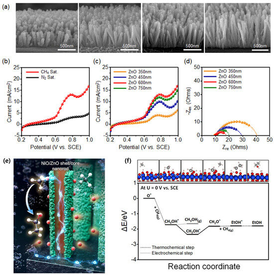 Kim et al. designed a shell/core-structured electrocatalyst consisting of NiO/ZnO nanorods for high CH4 electrochemical conversion that was based on the 1D morphology of the nanorods and the built-in potential at the NiO/ZnO interface that allows fast charge transfer. The conversion of CH4 can be optimized by controlling the length of the nanorod catalyst, as presented in Figure 4a–e. Regarding the 600 nm long NiO/ZnO nanorod, FE, selectivity, and conversion values were recorded as 61%, 81%, and 1084 μmol gNiO−1 h−1, respectively, at 1.5 VPt. Mechanistic studies revealed that the ethanol production pathway includes the formation of active oxygen species by dissociative adsorption of the CO32− oxidant, CH4 activation for methanol formation, and coupling of CH4 and deprotonated methanol (Figure 4f). Furthermore, the ethanol yield was improved by increasing the methanol solubility using sulfolane as a cosolvent and by in situ generation of the CO32− oxidant [44].
