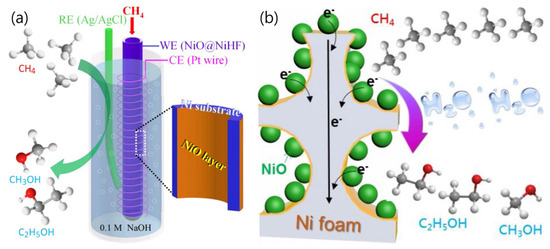 - Song, Y.; Zhao, Y.; Nan, G.; Chen, W.; Guo, Z.; Li, S.; Tang, Z.; Wei, W.; Sun, Y. Electrocatalytic oxidation of methane to ethanol via NiO/Ni interface. Appl. Catal. B 2020, 270, 118888. [Google Scholar] [CrossRef]