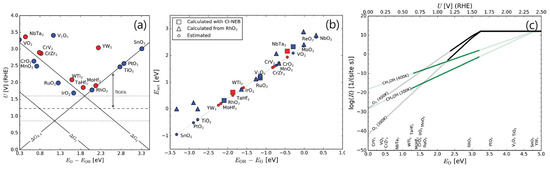 (a) Activity volcano plot of the OER for metal oxides (blue) and Mxenes (red). (b) Plot of methane activation energy versus the descriptor EOH − EO. (c) The reaction rates for the OER (black line) and methane oxidation (green line) versus EO and U at different temperatures [20]. Copyright 2018, Royal Society of Chemistry.