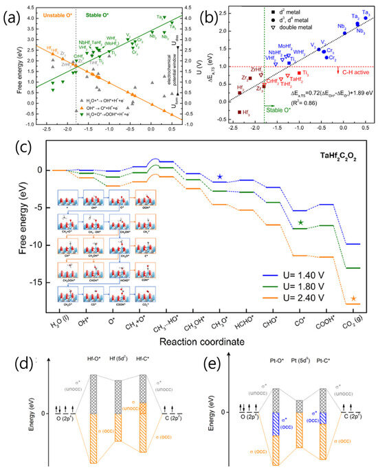 Hsieh et al. also supported the involvement of O* generated during the OER on an N-doped graphene material for methanol formation. Density functional theory (DFT) calculations indicated that the nitrogen atom in the vicinity of the active site stabilizes O* for C–H bond activation. The presence of active oxygen (O*) on the N-doped graphene led to a consistent electrode potential of 1.10 VSHE. Consequently, compared to O*-free N-doped graphene, active oxygen reduces the kinetic barrier energy of the rate-determining step (C–H bond activation) by 0.82 eV. This indicates the significant role of the anodic potential in the O* reactivity towards methanol formation. The activation of the C–H bond initiated by hydrogen transfer, coupled with the excitation of one electron from the O* lone pair to the surface π orbital, increased the radical character of O* for transferring hydrogen [55]. Similarly, Kang et al. provided important information for understanding the relationship between the stability of active oxygen species, C–H bond activation, and the selectivity of oxygenates. The O-terminated anode surface was predominant over the OH-terminated and metal-terminated surfaces under an applied potential. O* can accumulate on the surface of the catalysts when the lower limit of the electrochemical potential for O* formation is less than that of O*. Figure 9a indicates that the MXenes in the right leg of the volcano plot are suitable for CH4 oxidation, whereas those in the left leg favor OER. MXenes with a high proton affinity tend to stimulate the activation of the C–H bond, as indicated by the change in ΔEa,TS (C–H bond activation) for the ΔEOH* − ΔEO* (affinity energy of proton) that is presented in Figure 9b. In comparison to single-metal MXenes, bimetallic MXenes such as TaHf2C2O2 and CrHf2C2O2 can effectively perform CH4 conversion due to their low energy barriers for C–H activation. In the case of TaHfC2O2, the formation of a relatively stable intermediate species depends on the applied potential for TaHfC2O2. (Figure 9c). Additionally, TaHf2C2O2 favors the formation of oxygenates over hydrocarbons. The high tendency towards oxygenates can be attributed to the Hf–O bond being stronger than the Hf–C bond due to the small number of electrons in Hf (5d2) of TaHf2C2O2 (Figure 9d). Previous studies have reported that the formation of hydrocarbons, CO, and CO2 on metallic Pt can be explained by strong Pt and C interactions. As presented in Figure 9e, the number of electrons in the antibonding orbital of Pt–C was lower than that in Pt–O [56].