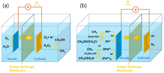 Schematic diagram of indirect electrochemical conversion of methane. (a) Indirect oxidation in catholyte and (b) indirect oxidation in anolyte [14,22,62].