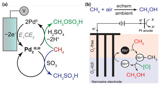 (a) Mechanism for electrochemical methane functionalization via a Pd2III,III intermediate [22]. Copyright 2017, American Chemical Society. (b) Electrochemical methane functionalization catalyzed via an Rh-based catalyst in nonaqueous media and Si nanowires as electrodes [71]. Copyright 2019, American Chemical Society.