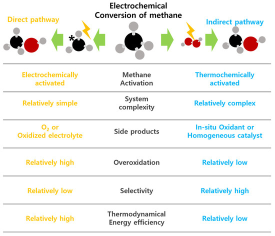 These studies discussed above are commonly known as indirect electrochemical conversions of CH4 to CH3OH. The term indirect refers to strategies that use methyl sulfonate or chloromethane as an intermediate product, as well as regeneration of the reagents for methane activation. An indirect strategy that uses electrochemical methods to produce and maintain highly reactive high-valent metal species is useful. This approach can accelerate a variety of kinetically demanding reactions by accessing catalytic intermediates for the functionalization of other chemically inert substrates. However, in indirect systems, back-reaction or cross-reaction of homogeneous intermediates is a concern; therefore, careful design of cells and catalysts is required for high conversion efficiency of methane. Finally, Figure 12 schematically illustrates the advantages and disadvantages of direct and indirect methane conversion.