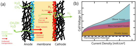 where Vthermo is the thermodynamic operating potential for methane-to-methanol conversion (0.58 VSHE), and Vapplied is the actual operating potential. Three primary factors limit VE. First, the transport processes in MEA are critical and must be understood to control the transportation of reactants and products. Figure 14a presents the gas and ion flows in the MEA structure during methane oxidation. The reactants, CH4 and H2O, should be transported to the electrocatalytic layer but not to the crossed membrane. However, protons should be transported to the cathodic electrocatalytic layer through an ion-conductive membrane, and the methanol product should not cross the membrane. However, the crossover of chemicals or poor proton transportation directly affects the VE of the MEA reactor due to the back reaction or reaction rate, which is limited by the poor mass transportation rate (mass transport losses). Second, the kinetics of the electrocatalyst are also critical for the efficiency of the overall reaction, as the overpotential of the electrocatalyst is directly related to the reaction kinetics on the catalyst surface (kinetic losses). Third, the ohmic resistance of the reactor influences the ohmic loss (VE). These three limiting factors are primarily controlled at different reaction rates (i.e., currents). For example, kinetics is the primary limiting factor for the overall reaction under low reaction rate conditions, but the ohmic resistance of the reactor becomes the primary limiting factor when the reaction rate is very high. The limiting factors controlling Vapplied are depicted in Figure 14b, in which the ohmic losses are coupled to mass transfer as the hydration of the membrane and ionomer depends on water transport. Both of these losses can be minimized by optimizing the reaction conditions (temperature and membrane width); however, reactant or product crossover and material stability can be the result of these tradeoffs.