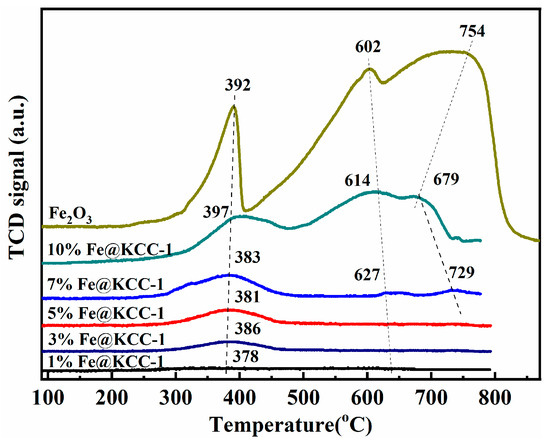 The reducibility of x%Fe@KCC-1 (x = 0, 1, 3, 5, 7 and 10) catalysts was investigated using H2-TPR (Figure 2). There were three reduction peaks of Fe2O3 with relatively large peak areas at 392 °C, 602 °C, and 754 °C, respectively. The first peak at 392°C was attributed to the reduction of Fe2O3 to Fe3O4, the peak at 602 °C was owed to the reduction of Fe3O4 to FeO, and the peak at 754°C was attributed to the reduction of FeO to metal Fe. Overall, the total reduction process was: Fe2O3 → Fe3O4 → FeO → Fe. There was also a redox cycle of Fe3+ ↔ Fe2+ ↔ Fe [21,22]. As Fe was introduced, the temperatures corresponding to all the reduction processes remained almost unchanged. In addition, as the Fe content increased from 5% to 10%, the areas of the three reduction peaks gradually increased, indicating that the number of active oxygen species increased, which was favorable for CO catalytic elimination [18].