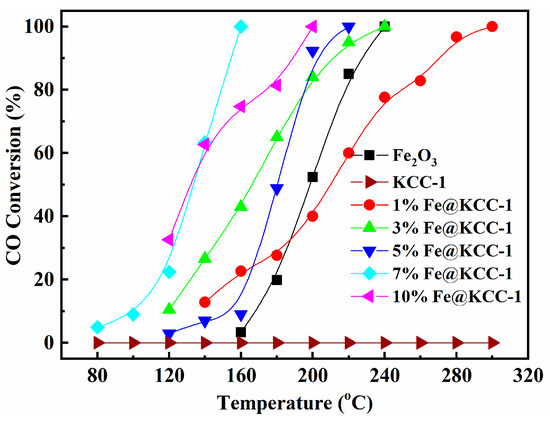 The CO catalytic activities of x%Fe@KCC-1 (x = 0, 1, 3, 5, 7 and 10) and related catalyst materials were evaluated, and the obtained results are displayed in Figure 3. Pure KCC-1 support showed negligible catalytic activity for CO oxidation under experimental conditions. After loading the x%Fe active component on the KCC-1 support, the CO conversion improved drastically. The x%Fe@KCC-1 (x = 0, 1, 3, 5, 7 and 10) catalysts exhibited better CO catalytic activity, and the following total CO conversion temperatures were obtained: 7%Fe@KCC-1 (158 °C) > 10%Fe@KCC-1 (197 °C) > 5%Fe@KCC-1 (218 °C) > 3%Fe@KCC-1 (239 °C) > 1%Fe@KCC-1 (298 °C). These results suggest that the morphological structure of the floral fiber microsphere mounts is conducive to the gas-solid heterogeneous catalytic oxidation reaction. It is noteworthy that the CO conversion of 10%Fe@KCC-1 is slightly lower than that of 7%Fe@KCC-1, which can be attributed to the higher content of the active component leading to its aggregation on the surface of KCC-1, resulting in a reduction of exposed Fe active sites, which is also observed in other reported catalysts [23,24]. The temperature-dependent reaction was calculated to estimate the apparent activation energy of the x%Fe@KCC-1 (x = 0, 1, 3, 5, 7 and 10) catalysts, and the CO conversion shown in Figure S5 was <20% to avoid diffusion limitations. Assuming that the combustion of CO in the presence of excess oxygen obeys a first-order reaction mechanism with respect to CO concentration (c): r = −kc = (−A exp(−EA/RT))c, where r, k, A, and EA are the reaction rate (mol·s−1), rate constant (s−1), pre-exponential factor, and apparent activation energy (kJ·mol−1) [25,26], respectively. Arrhenius plots of different catalysts with CO conversion at <20% and GHSV at 960,000 h−1 are shown in Figure S5. As calculated, the EA values of the four catalysts are, in order: 7%Fe@KCC-1 < 10%Fe@KCC-1 < 5%Fe@KCC-1 < 3%Fe@KCC-1, in which the 7%Fe@KCC-1 catalyst has the lowest EA value (96.2 kJ·mol−1), indicating that the prepared x%Fe@KCC-1 catalysts have excellent CO oxidation ability.