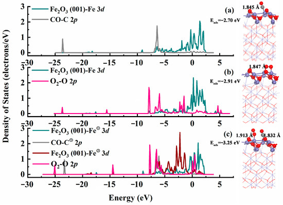 Figure 4. The optimized (a,b) single-molecule adsorption and (c) double-molecule adsorption configurations and PDOS on Fe2O3 (001) catalyst surface for O2 and CO gas molecules, respectively.