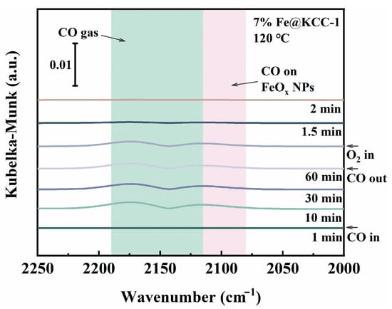 In order to study the transient intermediates of the CO catalytic removal reaction on the surface of the 7%Fe@KCC-1 catalyst more deeply, CO + O2 transient adsorption experiments were carried out at 200 °C, and the detected results are presented in Figure 5. The peaks near 2119 cm−1 and 2174 cm−1 are attributed to CO species linearly adsorbed on the surface Fe3+ sites (Fe3+-CO) [28]. These results indicate that CO can be readily adsorbed on the surface active sites of the 7%Fe@KCC-1 catalyst, where it formed reactive intermediates. As O2 was introduced into the system, these two peaks, corresponding to adsorbed state species of CO, disappeared rapidly. This suggests that the O2 adsorption activation capacity of x%Fe@KCC-1 catalysts may be stronger than that for CO, which strongly supports the DFT calculations results (Figure 4). Species found on the surface of the 7%Fe@KCC-1 catalyst indicate that the catalytic oxidation of CO mainly follows the Langmuir-Hinshelwood (L-H) and/or Eley-Rideal (E-R) mechanisms [29].