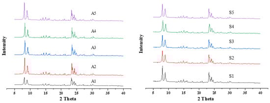 The X-ray diffraction patterns of the two series of molecular sieve samples are shown in Figure 1. There were five diffraction peaks at 2θ = 7.9°, 8.8°, 23.1°, 23.8°, and 24.4°, due to the inherent MFI topology structure [16]. Moreover, there were no obvious other peaks, indicating that each sample was a well-crystallized MFI pure phase. Furthermore, characteristic diffraction peaks of all as-prepared zeolites were basically consistent, with the decrease of alumina content, indicating that altering the Si/Al ratio of samples could not significantly influence the zeolite structure.