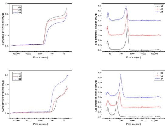 The left panel of Figure 3 shows the trend of cumulative pore volume with pore diameter. The content of alumina from A2 to A4 gradually decreased (Si/Al ratio increased), and the cumulative pore volume decreased, indicating that the product tended to be dense. The right panel, by differentiating and taking the logarithm of the liquid mercury squeezing volume and plotting the pore diameter distribution, clearly shows that the pore diameter distribution of the three samples was similar, and they all contained mesopores of 5–6 nm and macropores of more than 300 nm, among which the pore diameter of A4 was slightly smaller than that of the other two samples, and the distribution was wider. A comprehensive analysis of the mercury-pressure experimental data and the appearance of the samples showed that there was a correlation between the two. The mesopores of the samples should arise from the interstices of the microcrystal stacking within the agglomerates, while the macropores arise from the interstices between the agglomerate particles [19]. The agglomerate size of A4 was slightly smaller than that of the other two samples, and thus the macropore pore size was also slightly smaller.