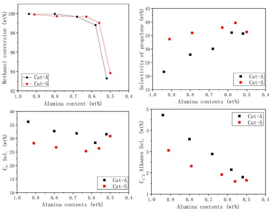 The conversion of methanol to hydrocarbon products involves a series of acid-catalyzed reactions, and the methanol conversion rate is closely related to the strength of the catalyst acidity. Comparing the data in Table 2, it can be found that most of the samples achieved close to 100% methanol conversion; however, when the alumina content decreased to a certain level, the methanol conversion of both morphologies of the molecular sieve catalysts decreased, indicating that the catalysts were less active and less acidic. However, the methanol conversion rate of the catalysts prepared from different morphologies of molecular sieves was not completely consistent, with the methanol conversion of the agglomerate morphology (Cat-A) being slightly higher than that of the hexagonal single crystal (Cat-S) when the alumina content was higher, while the conversion of the agglomerate samples was lower when the alumina content was low and the catalyst activity was insufficient (see Figure 5).