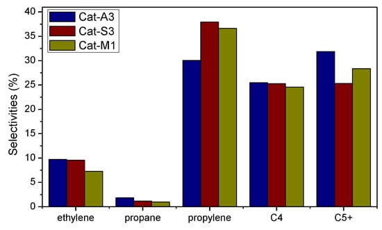 Figure 5 shows the product distribution of the chosen catalysts. We can see that selectivity to ethylene, propane, and C4 hydrocarbons decreased with the increase in strength of pore-confined effect, which conforms to the rule mentioned above. Surprisingly, Cat-S3 showed the highest selectivity to propylene and the lowest to C5+ hydrocarbons. This result is predictable if we take the cracking reaction into consideration. The cracking of C5+ hydrocarbons is a side reaction benefit that can produce propylene and help to reach a higher selectivity to propylene, as expected. The enhanced pore-confined effect of Cat-M1 led to a weakened cracking reaction, thus producing less propylene than Cat-S3, and correspondingly more C5+ hydrocarbons remained.