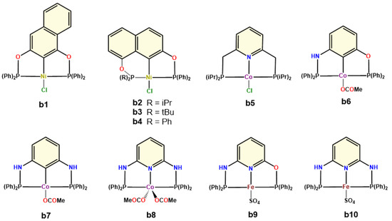 - Mukherjee, A.; Milstein, D. Homogeneous Catalysis by Cobalt and Manganese Pincer Complexes. ACS Catal. 2018, 8, 11435–11469. [Google Scholar] [CrossRef]