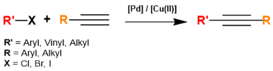 - Chinchilla, R.; Nájera, C. The Sonogashira Reaction: A Booming Methodology in Synthetic Organic Chemistry. Chem. Rev. 2007, 107, 874–922. [Google Scholar] [CrossRef] [PubMed]