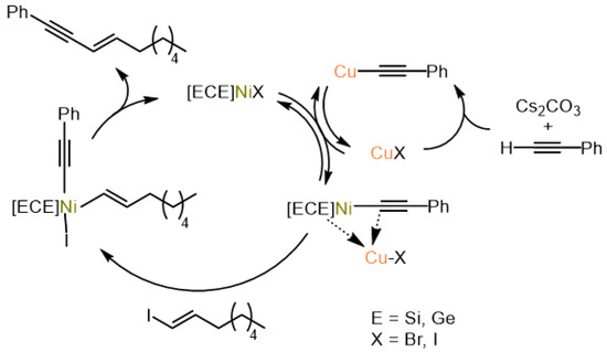 - Gallego, D.; Brück, A.; Irran, E.; Meier, F.; Kaupp, M.; Driess, M.; Hartwig, J.F. From Bis(Silylene) and Bis(Germylene) Pincer-Type Nickel(II) Complexes to Isolable Intermediates of the Nickel-Catalyzed Sonogashira Cross-Coupling Reaction. J. Am. Chem. Soc. 2013, 135, 15617–15626. [Google Scholar] [CrossRef] [PubMed]