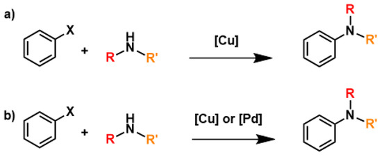 - Ullmann, F. Ueber Eine Neue Bildungsweise von Diphenylaminderivaten. Eur. J. Inorg. Chem. 1903, 36, 2382–2384. [Google Scholar] [CrossRef]