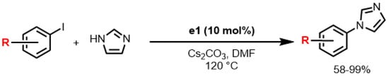 - Minnick, J.L.; Domyati, D.; Ammons, R.; Tahsini, L. C–X (X = N, O) Cross-Coupling Reactions Catalyzed by Copper-Pincer Bis(N-Heterocyclic Carbene) Complexes. Front. Chem. 2019, 7, 12. [Google Scholar] [CrossRef] [PubMed]