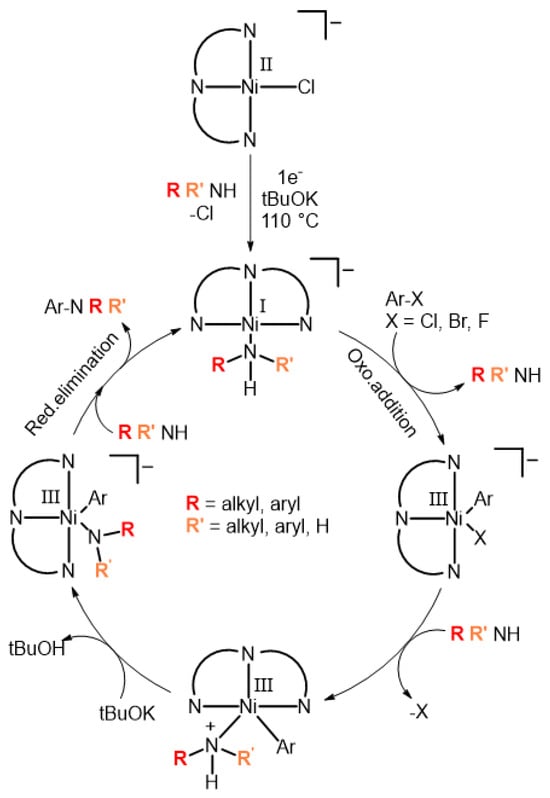 - Albkuri, Y.M.; RanguMagar, A.B.; Brandt, A.; Wayland, H.A.; Chhetri, B.P.; Parnell, C.M.; Szwedo, P.; Parameswaran-Thankam, A.; Ghosh, A. C–N Cross-Coupling Reactions of Amines with Aryl Halides Using Amide-Based Pincer Nickel(II) Catalyst. Catal. Lett. 2020, 150, 1669–1678. [Google Scholar] [CrossRef]